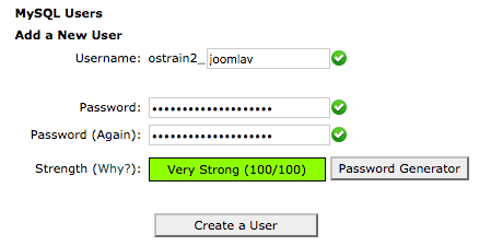- Choose a username. Enter a short username here, different from anything you’ve used before. In this example, I’m using "joomlav". The username is a little confusing because our hosting account name is added also, so in the image below, our full username will be ostrain2_joomlav.