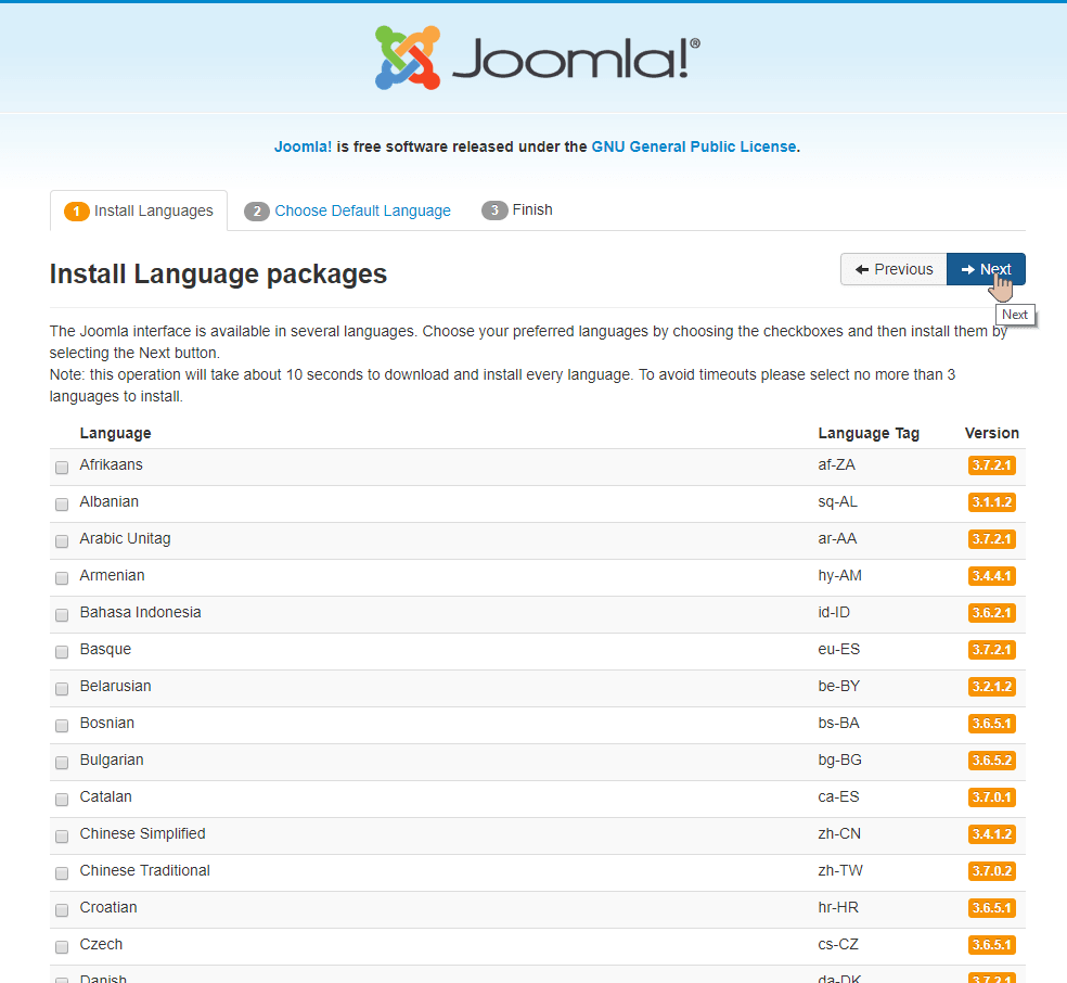 - You should see an installation screen like the figure below. This is the first step in Joomla’s easy-to-use installation manager.