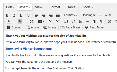 For example, in the second half of the Welcome to Joomlaville article, you have suggestions for site visitors. You can put a subheading in there to break up the text and make it easier to read. Here’s how you do it: