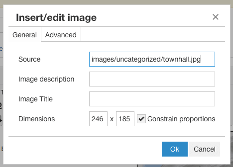 - Click on the "Insert/edit image" button, and you see a pop-up screen where you can edit the image settings. You can change the image’s width and height here:
