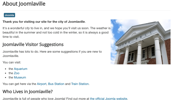 - Go to "Content", then "Articles", and then “About Joomlaville”. Your article should look like the screen shown in the image below.
