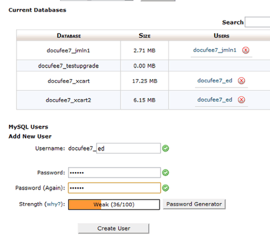 Notice that on this server, the username is automatically added to the name you created. So the actual database name that you will need for your configuration would be (in this case) docufee7_testupgrade. It's a good idea to write this down.