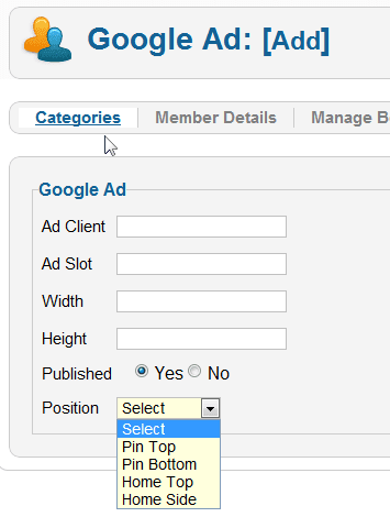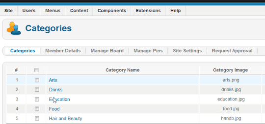 Social Pinboard comes with some pre-installed categories, but you can add more or change these if you want. This is a simpler process than the usual Joomla category creation process. There are no nested categories. You can add a category image, but no description or introduction.