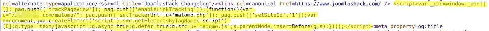 Go and check the HTML source code of your Joomla site. You should see the JaveScript code snippet from your Matomo installation embedded between the opening <head> and closing </head> tags: