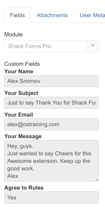 - Use the Fields tab to see the data, entered by the form sender into the form's fields: