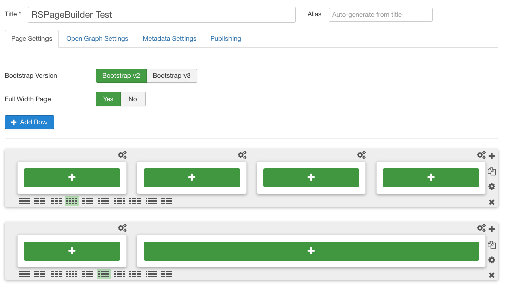 RSPageBuilder is a product from RSJoomla. After installation, you go to Components > RSPageBuilder and you see a screen like this. You design your layout by adding rows and columns.