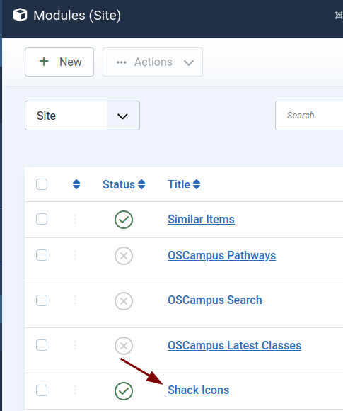 Go to the "Modules: Site" screen to see that a Shack Icons Pro module has been automatically created. If you don't see it, click "New" and add a new version of the Shack Icons Pro module: