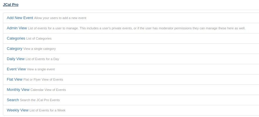 - Different menu items linking directly to different JCal Pro® views (Monthly View, Weekly View, etc...)