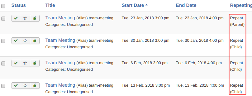 JCal Pro® automatically deleted all Repeat (child) events and re-created the new series of child event based on the updated parameters I entered.
