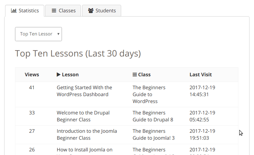 The Top Ten Lessons report displays top viewed lessons in the last 30 days, with the name of the lesson, its class, when it was viewed the last time and the total number of its views.