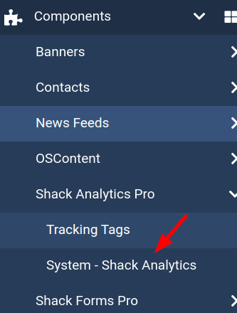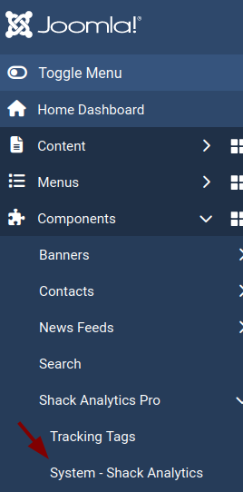 - In your Joomla admin dashboard, go to Components > Shack Analytics Pro > System - Shack Analytics: