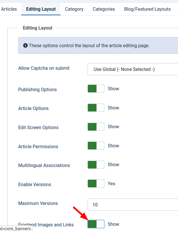 - You will see the "Articles: Options" screen, as you can see in the next image. Click the "Editing Layout" tab and then click "Show" for the "Frontend Images and Links" setting: