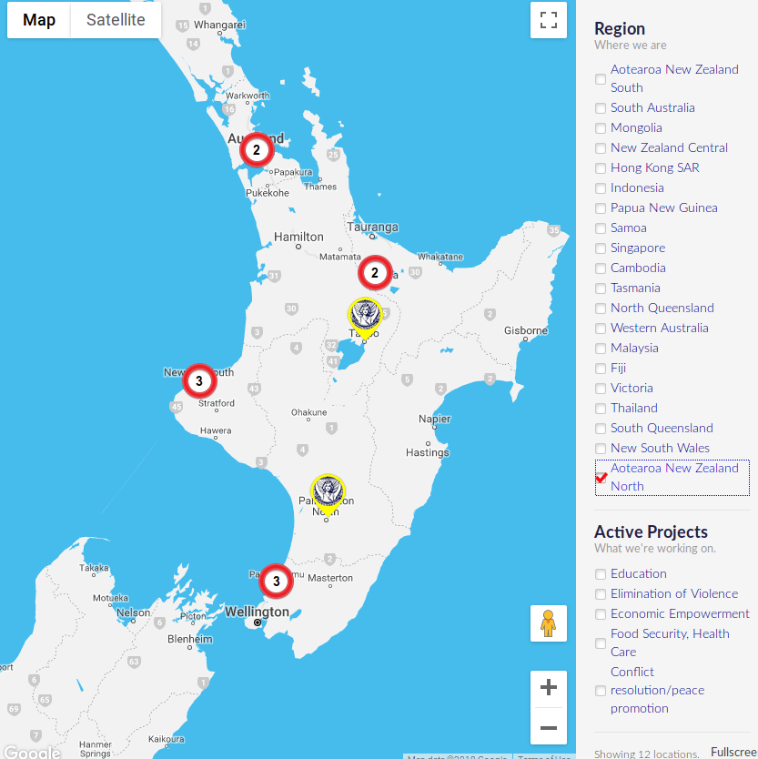 As you can see on the screenshot above, the map has been zoomed and panned to fit in all the Aotearoa New Zeland North Soroptimist Clubs. Two markers on this map each pinpoint to a club. For other markers, each pinpoints to a cluster of clubs. All in all, the map displays to you all of the clubs in the Aotearoa New Zeland North.