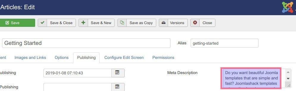 - og:description - According to Facebook documentation for webmasters, this meta tag contains "a brief description of the content, usually between 2 and 4 sentences. This will [be] displayed below the title of the post on Facebook." Shack Open Graph plugin will pull the content of this meta tag firstly from your Joomla article's tab Publishing > parameter Meta Description, shown in the next image. If an article Meta Description is empty, Shack Open Graph will pull look at the Meta Description parameter in the Global Configuration.